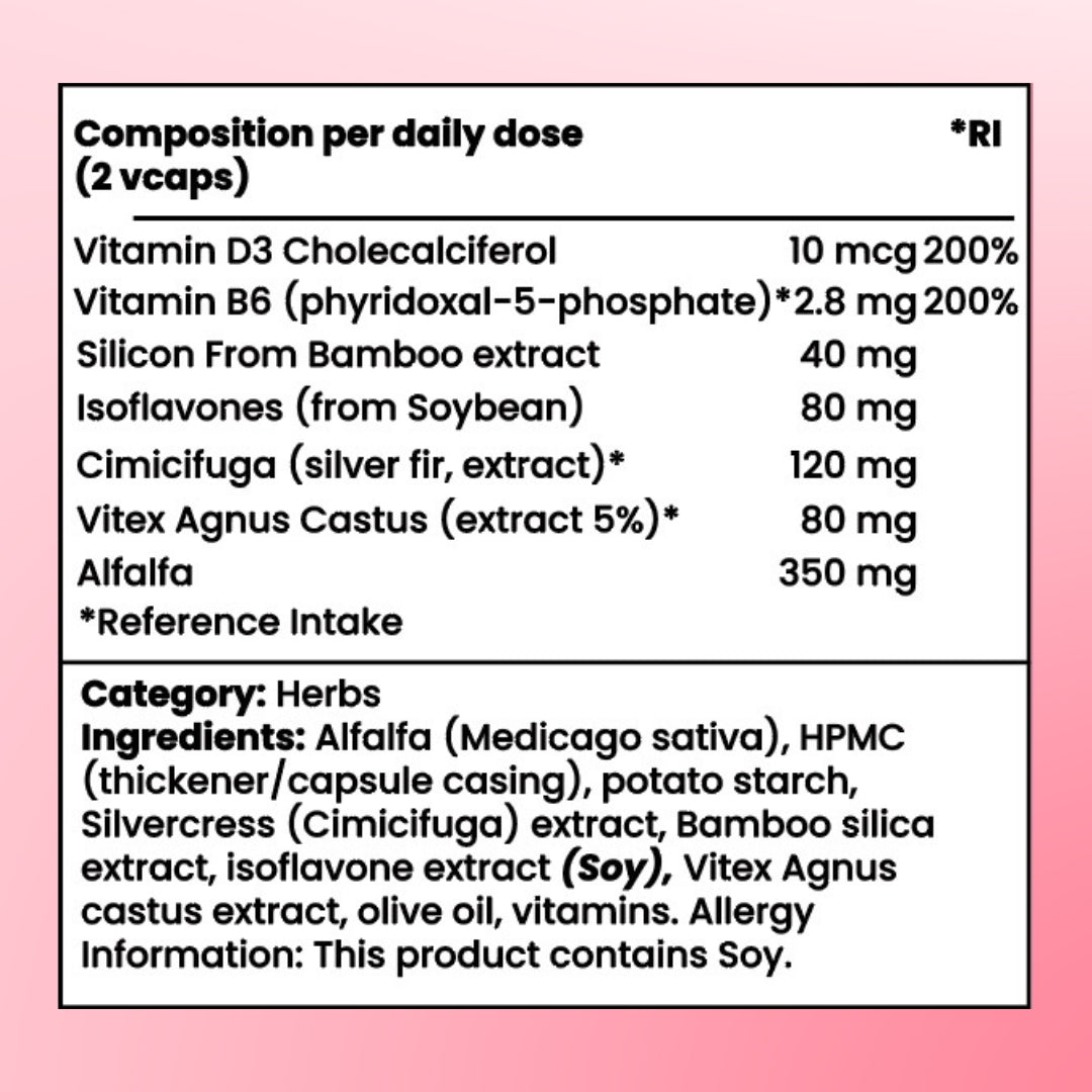 Enthält Pflanzenextrakte, die nachweislich PMS-Symptome, Hitzewallungen, Müdigkeit, Erschöpfung, Stimmungsschwankungen lindern und helfen, hormonelles Gewicht zu reduzieren.